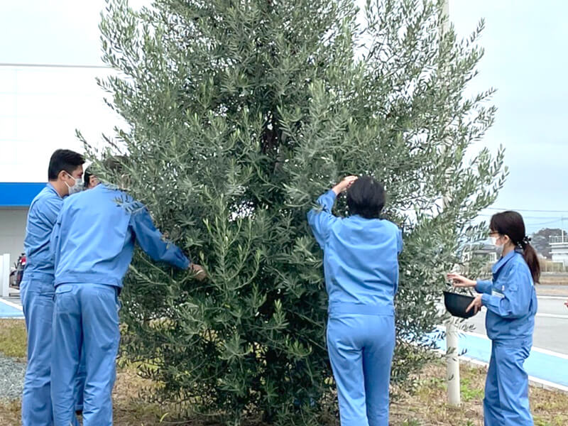 工場内にオリーブの木があり、収穫した実は食堂で活用予定。オリーブの他にも、金柑、蜜柑を植えています。